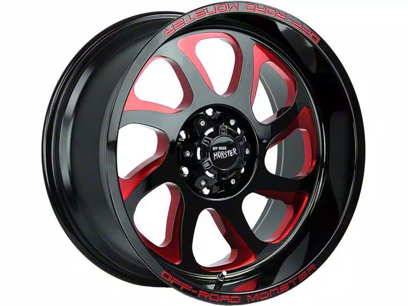 Off-Road Monster M22 Gloss Black Candy Red Milled 6-Lug Wheel; 20x10; -19mm Offset exudes sophistication with its finish, offering a sleek and modern appeal to any vehicle it adorns. The design is meticulously crafted to enhance the aesthetic of your vehicle, giving it a distinctive and upscale look. Perfect for those seeking to elevate their vehicle's style, this wheel blends seamlessly with both contemporary and classic vehicle designs, making it a versatile choice for a wide range of vehicles. Its robust construction ensures durability, making it a reliable choice for drivers who value both style and quality.