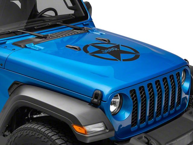 On the Move Star with Jeep Logo. Now you can add patriotic US Military styling to your Gladiator JT with this Jeep Licensed by RedRock Star Decal. This Decal design harkens back to the second world war and was used to identify US vehicles from the ones that were already in use by the allied forces. This Jeep Star Decal measures 20 x 20 inches and can be applied to any smooth flat surface and looks especially good across your hood, or on your door.
