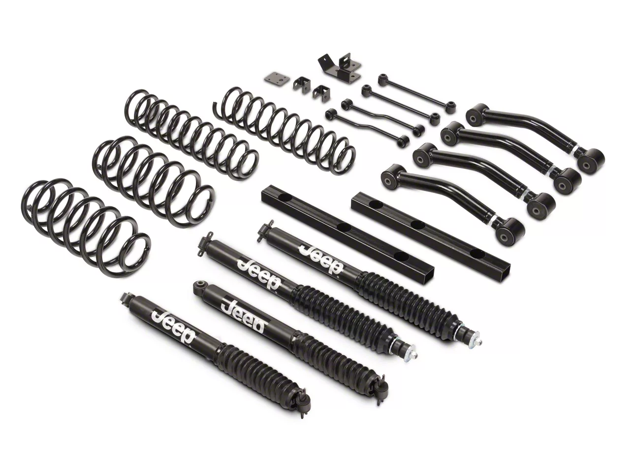 Go Off-Road. Off-roading can be tough on your TJ Wrangler’s stock suspension, that's why you need a lift kit that was specifically designed to take on the great outdoors. Luckily, this Jeep Licensed by Mammoth 4-Inch Suspension Lift Kit has what you need to help you take on the obstacles found on and off-road. With 4 inches of lift, this kit can accommodate tires up to 35-inches in size. This Lift Kit features linear coil springs, bump stops, sway bar end links and adjustable control arms. What’s more, the included monotube shock absorbers will provide a highly comfortable ride, even when tested across rough terrain.