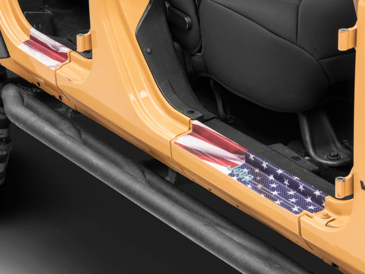 Application. These Jeep Licensed by RedRock Carbon Fiber Door Sill Decal; Real Flag are designed to fit 2007-2018 Jeep Wrangler JK models. Driver and passenger side included.
