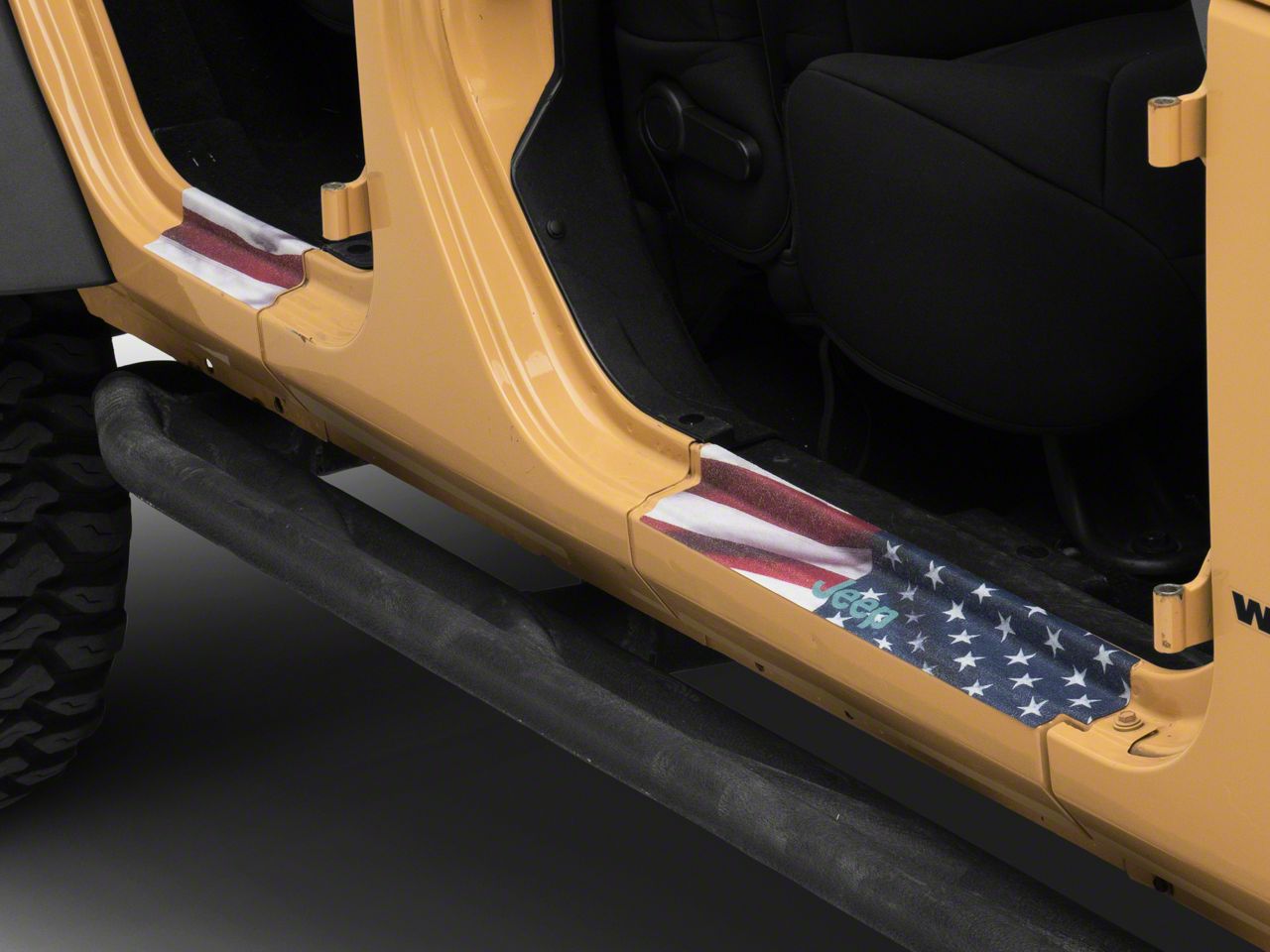 Application. These Jeep Licensed by RedRock Door Sill Body Shield Decal; Real Flag are designed to fit 2007-2018 Jeep Wrangler JK models. Driver and passenger side included.