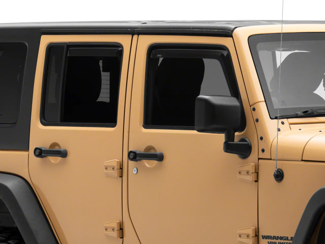 Application. These Jeep Licensed by TruShield Element Tinted Window Visors; Front and Rear are designed to fit 2007-2018 Jeep Wrangler JK 4-door models. Includes front and rear, driver and passenger side deflectors.