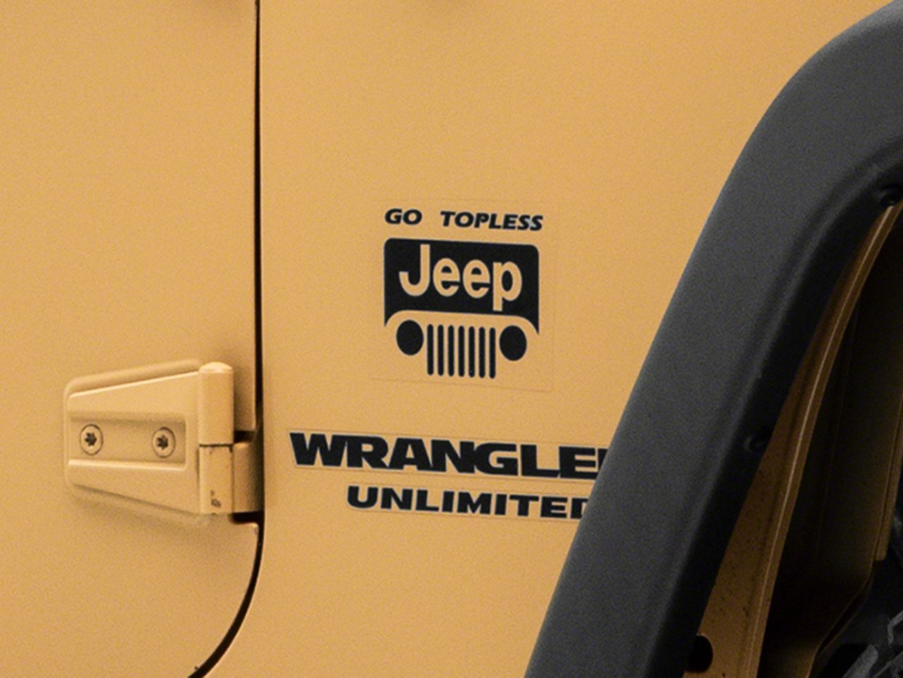 Application. This Jeep Licensed by RedRock Go Topless Jeep Decal; Gloss Black is designed to fit 1987-2018 Jeep Wrangler YJ, TJ and JK models. Sold individually.