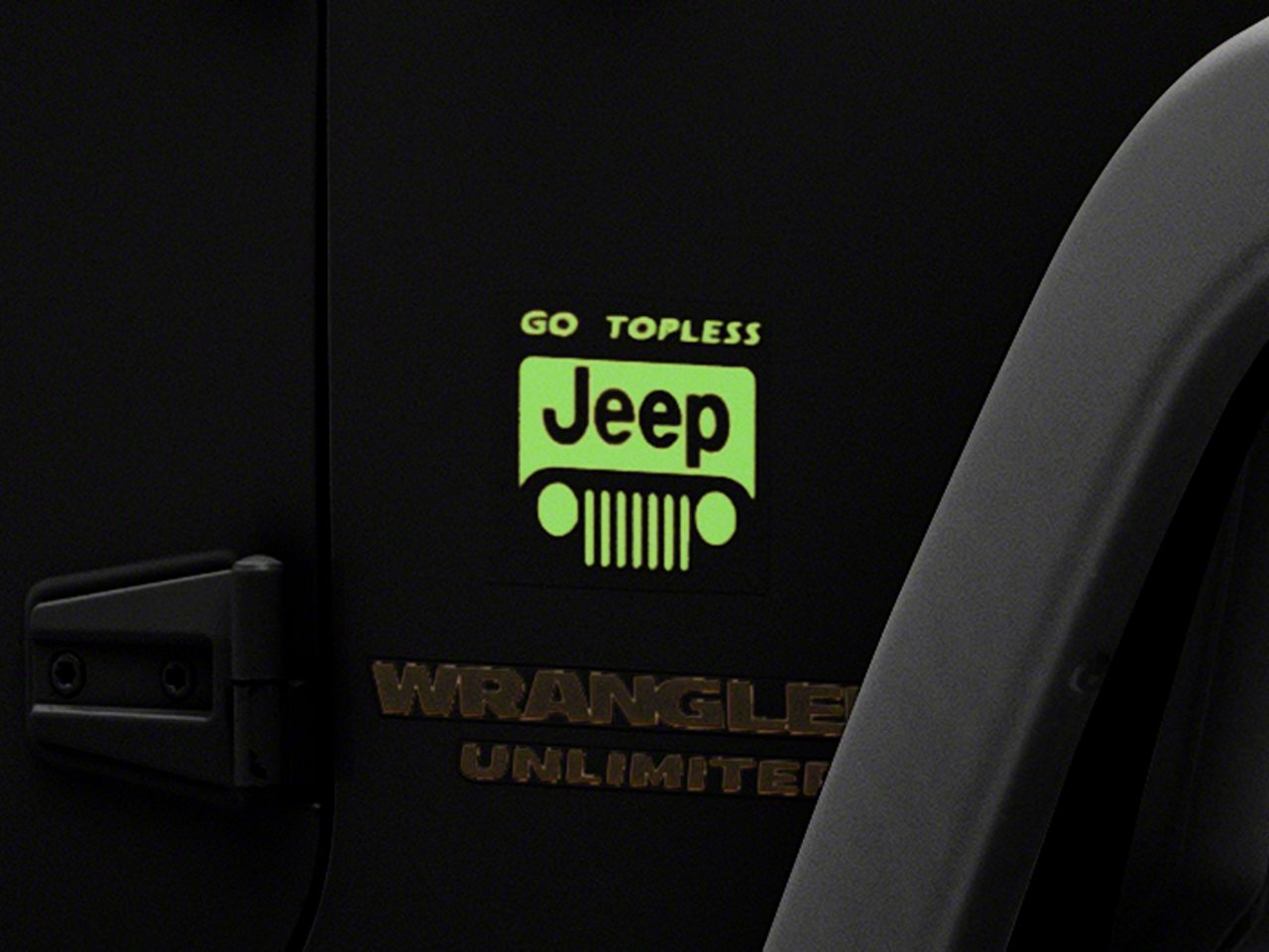Application. This Jeep Licensed by RedRock Go Topless Jeep Decal; Lime Green is designed to fit 1987-2018 Jeep Wrangler YJ, TJ and JK models. Sold individually.