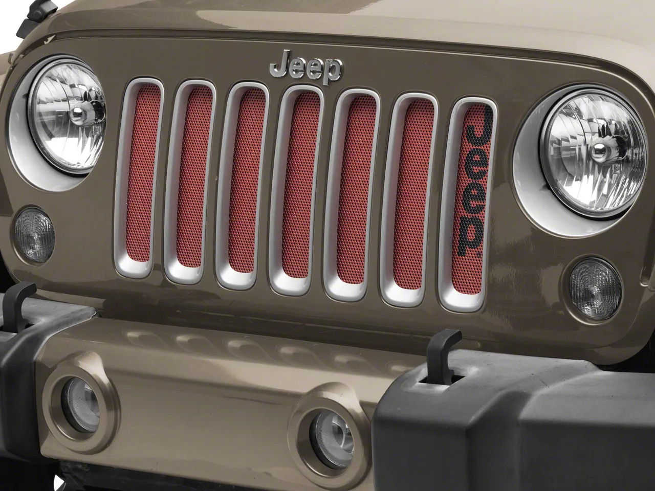 Styling and Protection. A perforated aluminum grille insert is a great way to add extra style and protection to the front end of your JK Wrangler. Ideal for daily drivers and off road enthusiasts, this JK Grille Insert will protect your Wrangler's radiator from all types of trail hazards and road debris, while the red background with Jeep Licensed by RedRock logo in black will add an extra blast of color to your ride.