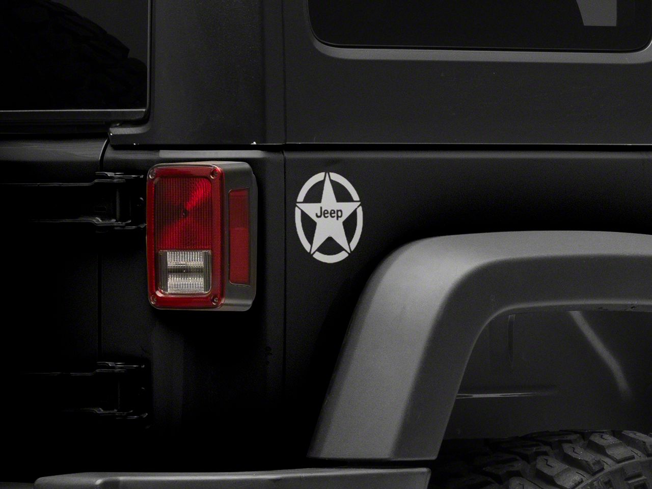 On the Move Star with Jeep Logo. Now you can add patriotic US Military styling to your JK Wrangler with this Jeep Licensed by RedRock Star Decal. This Decal design harkens back to the second world war and was used to identify US vehicles from the ones that were already in use by the allied forces. This Jeep Star Decal measures 5 x 5 inches and can be applied to any smooth flat surface and looks especially good across your hood, on your door, or rear quarter panel.