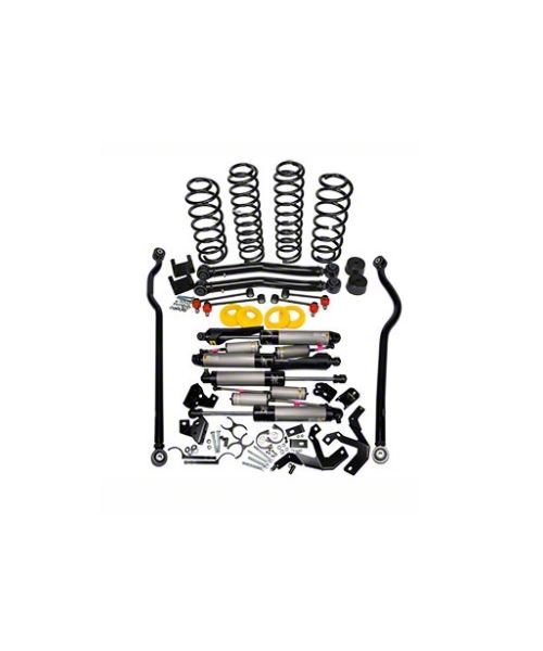 High-Tech Front and Rear BP-51 Shocks. This light load suspension lift kit replaces your front and rear dampers with the high-tech BP-51 remote reservoir shock absorbers. These shocks’ remote reservoir design makes them capable of taking even the worst abuse on the trails without fading. On the highway, these shocks provide a firm but smooth ride with an outstanding handling feel. What’s more, these shocks feature independent compression and rebound damping adjustment, giving you the option to fine-tune your Wrangler’s ride quality for the terrain you’re on.