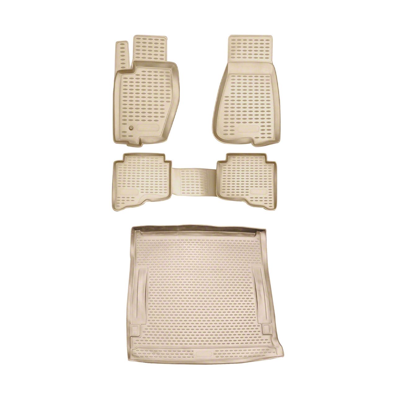 Full-Coverage All-Weather Interior Protection. The OMAC All Weather Molded 3D Front, Rear, and Cargo Floor Liners; Beige offer complete interior defense for your 2005–2010 Jeep Grand Cherokee WK. This premium five-piece set includes precision-molded liners for the front seats, rear row, and cargo area—delivering total floor protection from daily messes, outdoor debris, and unexpected spills.