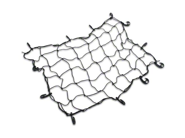Construction. The Rugged Ridge cargo net is a storage fixture made out of elastic bungee cord material. Plastic hooks line its edges to grip whatever it is stretched over. It is a universal cargo net, able to used with any vehicle in any situation where it can attach and be used to control the movement of cargo. It can be folded down to 8 inches by 5 inches by 5 inches. It comes with a 5 year limited warranty against defects.