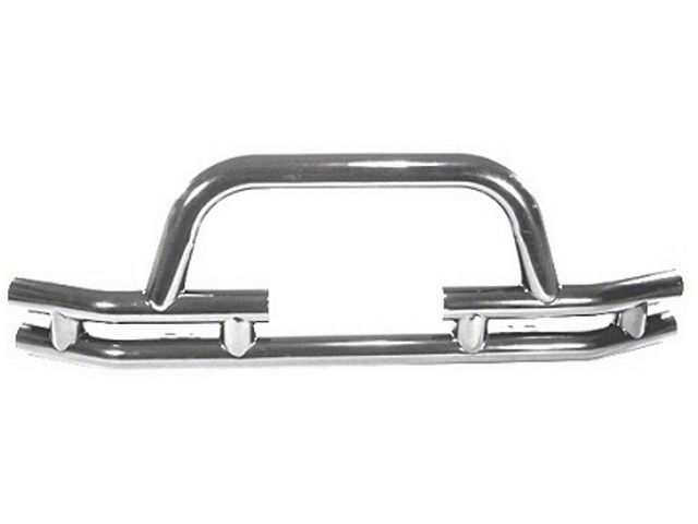 Construction. The Rugged Ridge Tubular Front Bumper with Hoop is made from high-quality 3-inch stainless steel tube for strength and durability. Its polished finish adds a tough look to your jeep.