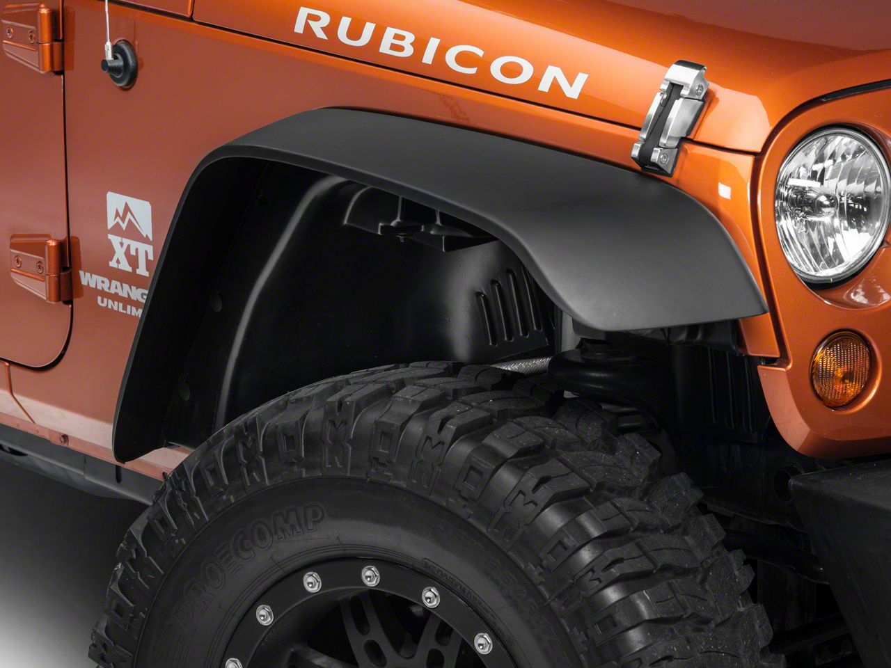 Specs. These flares allow for bigger tires without the need of a lift kit or cutting into the Jeep's body. Using larger tires without lifting your JK keeps the center of gravity lower for better stability on the highways. These flares provide 1.5 inches less tire coverage in the front and 1 inch less in the rear. Despite the narrower dimensions, these flares provide appropriate tire coverage while maintaining the aggressive look of a stock JK.