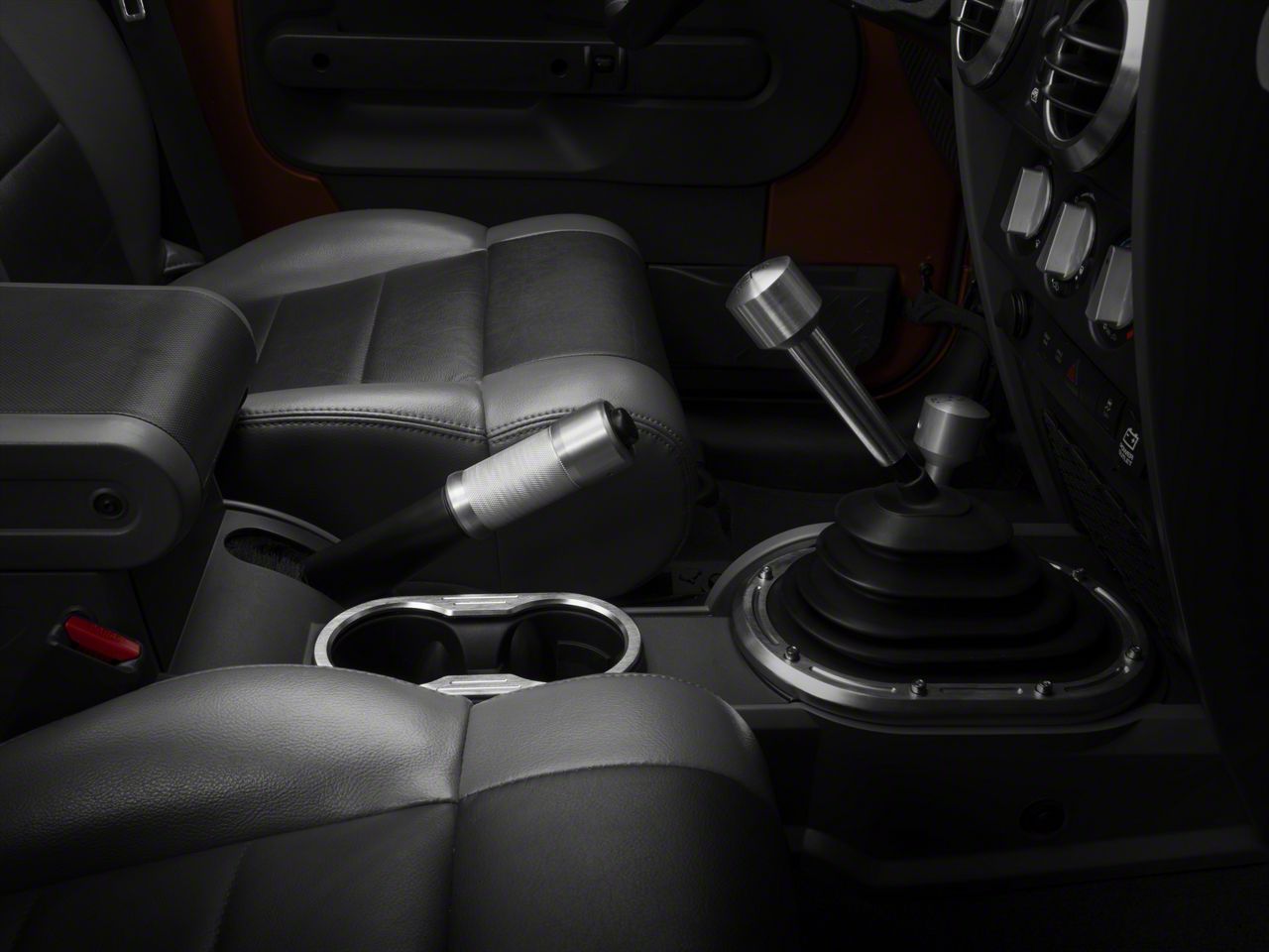 Construction. Rugged Ridge uses CNC machined billet aluminum to construct their interior accessories. This emergency brake handle is sure to add a unique style to your JK's interior. This handle is available in either a brushed aluminum or a black anodized finish.