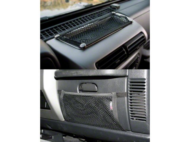 Storage Benefits. There are many uses for this product, including adding maps, papers, and other items that you'll permanently leave in your Jeep but want out of the way. Another option is to slide your mp3 player or phone inside. You'll be able to keep an eye on it, but it won't be sliding around and getting in the way. The dash-mounted net is a great spot to throw your change for easy access when you need it.