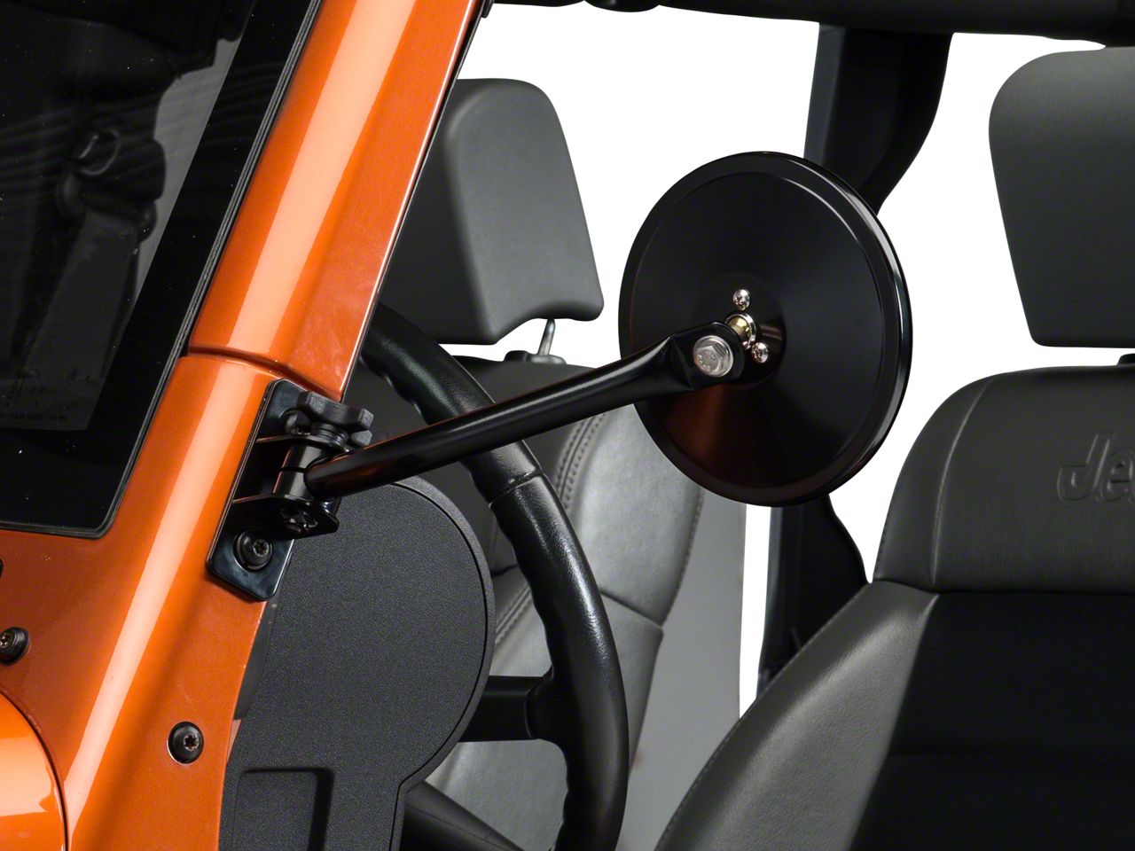 Hassle free Setup. If you want go door-less without compromising your side-view visibility, get the Rugged Ridge Quick Release Round Mirror Relocation Kit. It consists of a pair of new round side view mirrors, body brackets, nuts and bolts for easy installation. Secure each mirror arm and mirror to the windshield with a locking knob. The adjustable and extended mirror arms give you optimum visibility with or without doors.