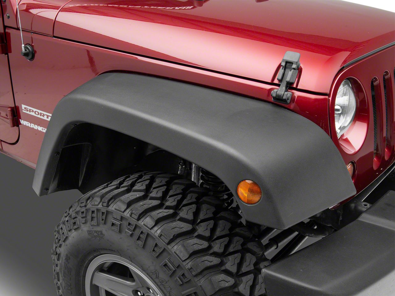 Construction and Appearance. These Fender Flares are engineered from UV-treated thermoplastic, which are remarkably resilient. They are colored black to perfectly complement your Wrangler, no matter its color. Please note, marker lights are sold separately.