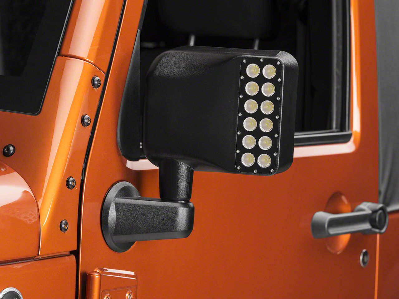 Increase Visibility. Improve your peripheral off road visibility in low light by upgrading your factory mirrors with Oracle's Side Mirror Housings with Off Road Lights. Custom designed for JKs, these housings are a direct fit for your factory equipment and will easily upgrade your rig with 24 LEDS. A 45 degree beam pattern will cast light forward to cover your peripherals for increased visibility over tough hazards and terrain. Thanks to this integrated mirror design, you'll no longer need to solely rely on spot lights and can choose to leave your A-Pillar mounts clear for better visibility off road.