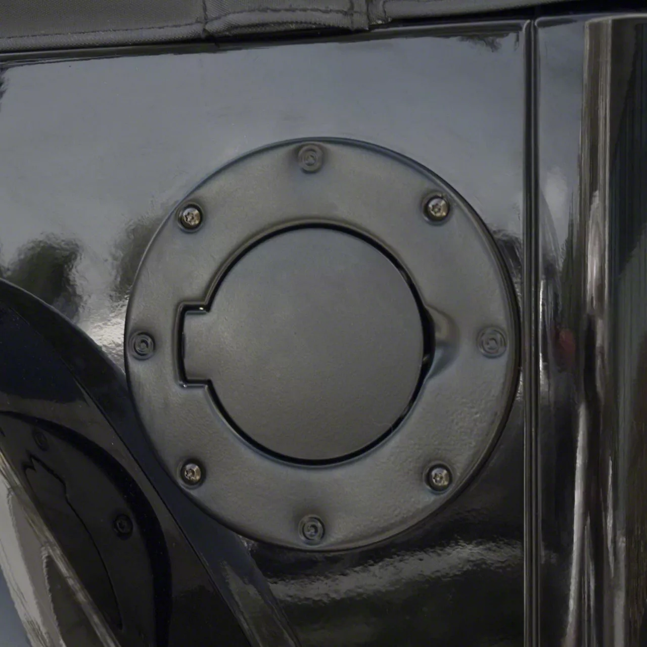 Description. Outland Automotive understands that when it comes to your Jeep, every detail matters! Now offering you the chance to create a custom look in just a few minutes, this black steel non-locking gas cap door fits directly over the existing gas cap opening. These covers install over the top of your factory gas cap into existing mounting points. No drilling required. Includes all necessary hardware.