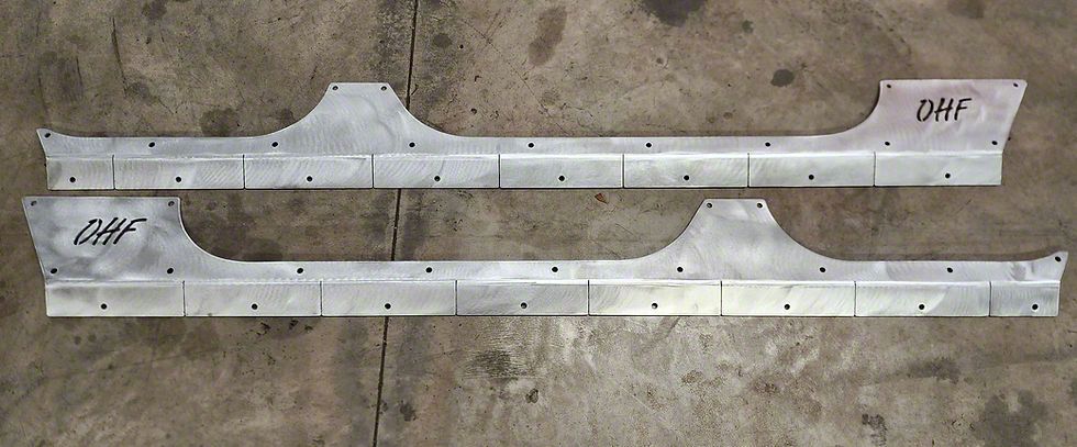 Construction and Appearance. Fabricated from laser-cut 3/16" aluminum, these rocker skins provide a lightweight yet durable barrier that won’t rust. Supplied raw and uncoated, they offer a sleek, industrial look that complements rugged off-road aesthetics and can be customized with finishes if desired.