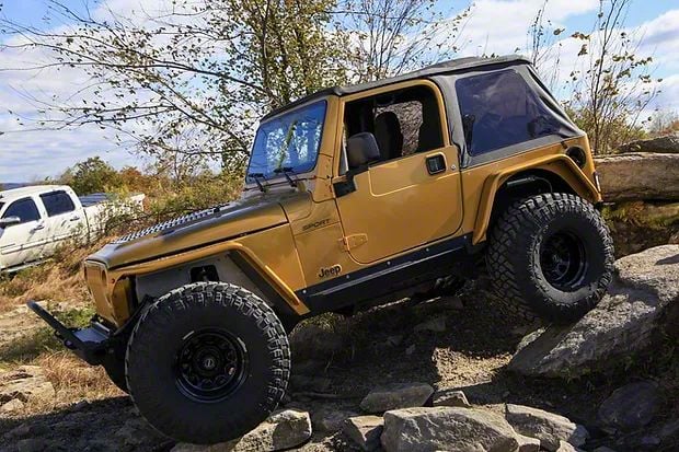 Protective with High Clearance. Made for the Jeep Wrangler TJ models, excluding Unlimited models, these Outta Hand Fabrication Insanity Rock Sliders come in pairs with a matte black finish. Built in the USA from 3/16 inch HRPO US made steel with a strong and sleek mounting design and high clearance, these rock guards are meant to protect your ride against rocks, mud, and other road debris during your off or on-road travels.