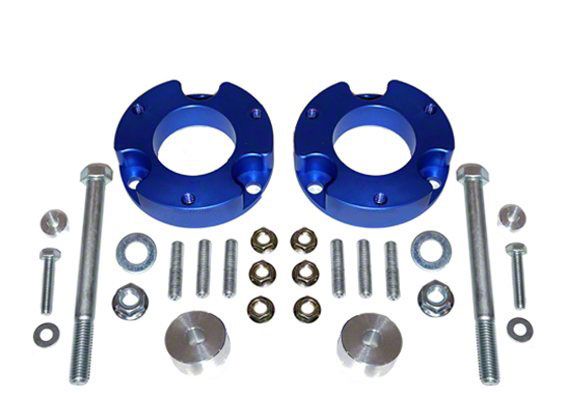 Blue CNC Machined Aluminum. The Leveling Kit is designed with style and performance in mind. It has a blue anodized finish with a laser-etched logo for extra detail and craftsmanship. Plus, it's made of CNC-machined billet aluminum, which makes it reliable - perfect for off-road adventures or everyday life.