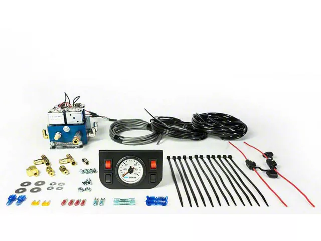 Versatile Components. Designed for use with an existing onboard system, this kit includes an on/off activation switch to operate the compressor, as well as switch(es) for easy inflation and deflation of your rear air springs. The kit features actuated 2-way pneumatic solenoids and a stackable solenoid block for various applications, making it versatile and suitable for different setups.