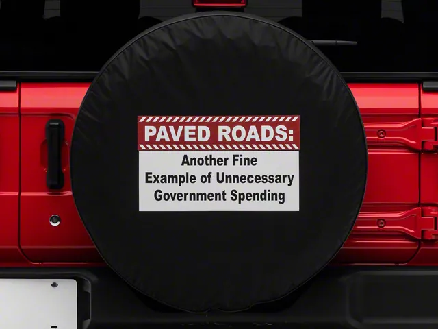 Design. This spare tire cover features a red and white construction sign type top that reads "PAVED ROADS:," while the black text with white background says, "Another Fine Example of Unnecessary Government Spending." It certainly sends the message you enjoy off-roading.