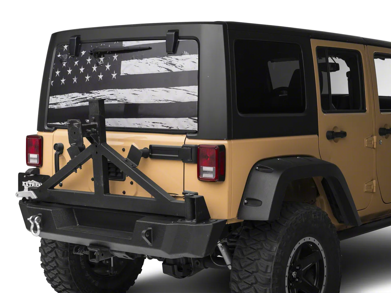 Be A Patriot. Fly the flag proudly with the Perforated Distressed Flag Rear Window Decal for your Jeep Wrangler. This American flag decal for the back window will show everyone how much you care, but won't compromise on safety.