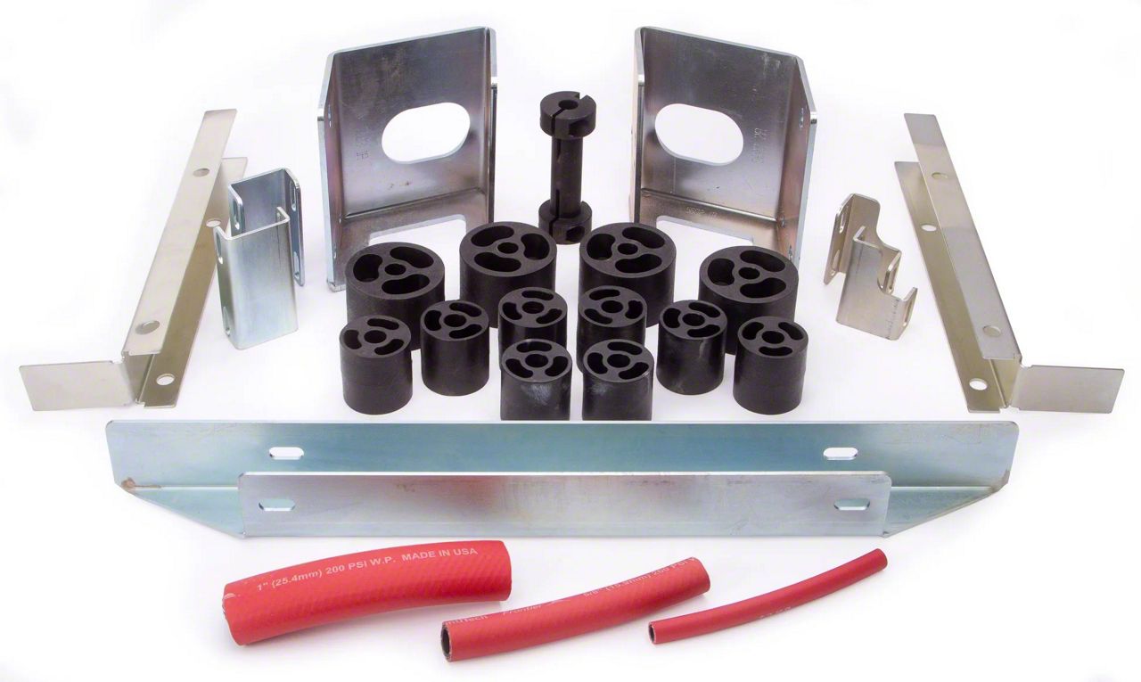 Performance Accessories 3" Body Lift Kit raiseS the vehicle for adding larger diameter tires while maintaining the factory suspension system and ride characteristics. The kit includes high-pressure, fiberglass-reinforced, nylon lift blocks, 3/16 inch thick laser cut and powder coated front and rear bumper relocation brackets, a CNC machined and zinc plated steering extension, high strength hardware, and extension brackets. A set of urethane wheel-well Gap Guards are available separately, and are used to conceal any gaps between the body and frame. This system can be installed in 6-7 hours and comes complete with everything necessary for installation.