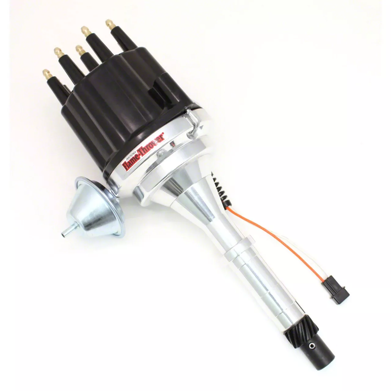 Electronic Distributor Replacement. The PerTronix Flame-Thrower Electronic Distributor with Magnetic Trigger; Male Terminals; Black is designed to replace stock distributors with increased reliability and performance. It uses a magnetic pickup to produce precise ignition timing signals at all engine speeds, ensuring smoother operation and improved spark timing consistency. This distributor is vital for enthusiasts seeking dependable ignition in AMC 290-401 engine applications.