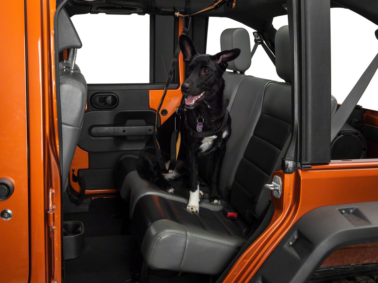 Easy Restraint. This multi use zip line attaches easily to your Wrangler's seat belts or grab bar handles to provide a tethered connection for your dog. Durable and adjustable, this kit comes with a carabiner equipped leash, giving you full control when its time to unload and exit your Jeep.