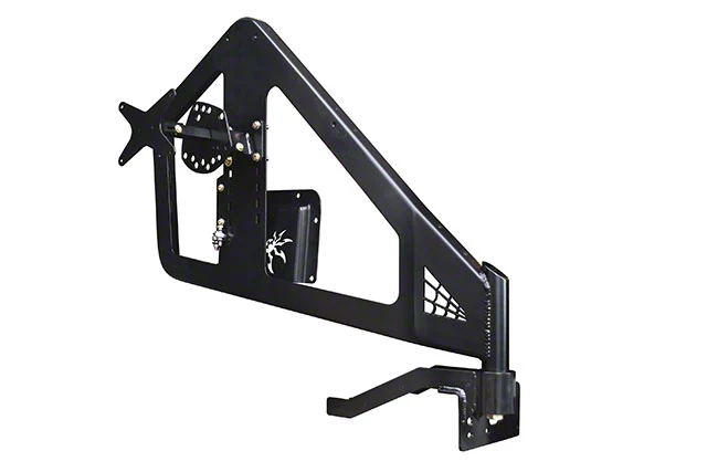 Nifty Design. To guarantee a stable mounting, this tire is mounted directly onto the frame. This is done to spread the weight evenly, thus minimizing the stress on your Jeep Wrangler’s body or bumper. This tire carrier also features a Single-Action opening wherein the tire carrier is tethered to the tailgate so you can access the tire carrier and tailgate at the same time and without interfering with each other. Topping these off, this tire carrier assembly is adjustable up and down and in and out thus allowing you to carry bigger tires of up to 40 inches.