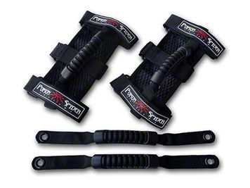 Provides Solid Entry Ability for All Jeep Seats. Not only do the Poison Spyder Front & Rear Grab Handles make it easier to get onto the seats of your four-door Jeep, but it also provides a firm grip as you and your fellow occupants bounce with the rough terrain of the wild. The set of four consists of two Poison Spyder Universal Grab Handles, which mount in the front via the stock header bars or aftermarket cages; and two JK Rear Bolt-In Grab Handles, which mount in the back via the factory sound pod fasteners.