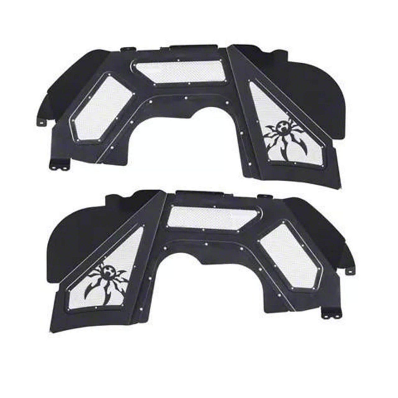 Form and Function. Our Poison Spyder Vented Inner Fenders are the best looking, best functioning aftermarket front inner fenders for your Jeep Wrangler JL & Gladiator JT. The Poison Spyder JL/JT Vented Inner Fenders dress up the look of your front wheel wells with beautiful CNC laser cut, bead-rolled and brake-formed aluminum panels with stainless steel mesh vented inserts. Durbale Construction. The main panels are made of 16 gauge 5052 aluminum, while the vent panels are heavy duty stainless steel wire mesh. The CNC bead-rolled features look great and give the product a distinctive motorsports flare, but the beads actually help stiffen the product for further strength. Covered by our Limited Lifetime Warranty, these inner fenders are shipped in BLACK SpyderShell armor coat which carries a 1-year finish warranty. Look Cool, Run Cool. The vented feature helps promote airflow through the engine bay, helping your Jeep run cooler. They also look great and fit seamlessly with our Poison Spyder Crusher Flares, but they're a great addition to any Jeep JL Wrangler or Gladiator JT, whether it still has the stock flares, aftermarket plastic flares or other manufacturers' metal flares.