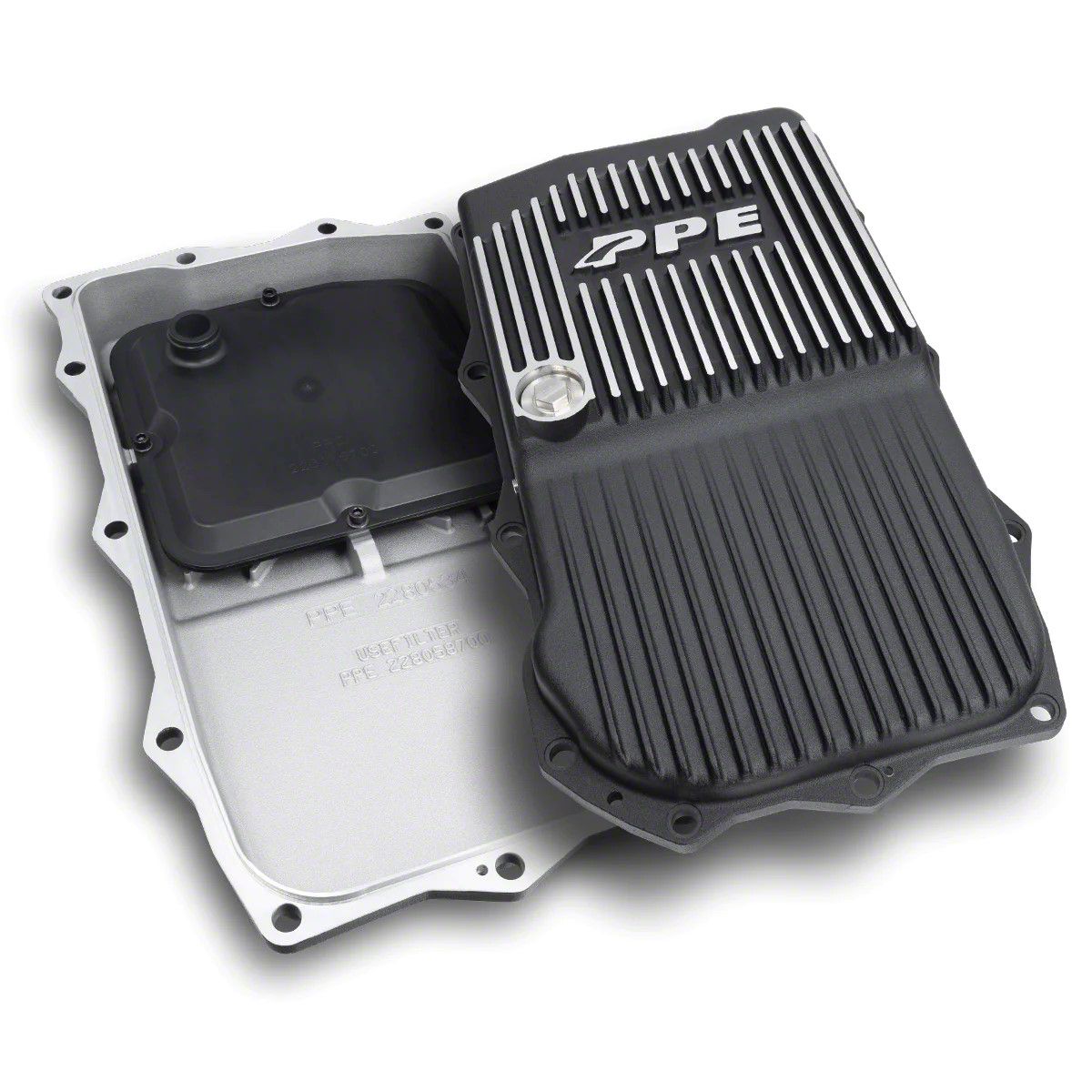Performance and Durability. The PPE Heavy-Duty Cast Aluminum Transmission Pan (Brushed) is a cutting-edge automotive enhancement designed to elevate your vehicle's performance and durability. Its specialized design incorporates Internal Heat Sinks and External Cooling Fins, effectively reducing transmission oil temperatures and preventing overheating during rigorous driving conditions. With cooler oil maintained, the transmission service life is significantly extended, minimizing maintenance costs and enhancing overall performance.