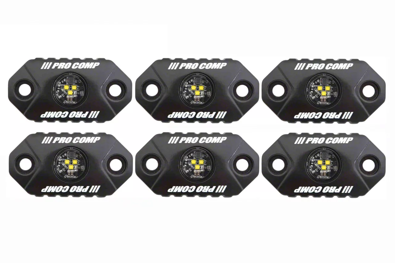 High-Intensity Illumination. The Pro Comp LED Rock Light Kit delivers high-intensity white illumination, enhancing night visibility for off-road adventures. These lights provide ample illumination to navigate through dark trails and rough terrains safely. The compact and low-profile design ensures they fit seamlessly under your vehicle, offering a clean and unobtrusive appearance. This rock light kit is essential for off-road enthusiasts who require reliable lighting to tackle challenging conditions at night.