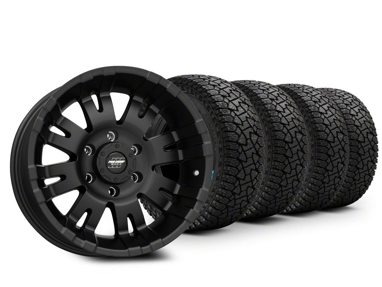 Mounted and Balanced Wheel and Tire Kit. This wheel and tire combo kit features (4) 17x8 Pro Comp Wheels 01 Series Satin Black 6-Lug Wheels and (4) Gladiator All-Terrain X-Comp A/T 265/70R17 tires that have been put together into an easy to buy kit that arrives to your door already mounted and balanced ready to be installed on your vehicle.