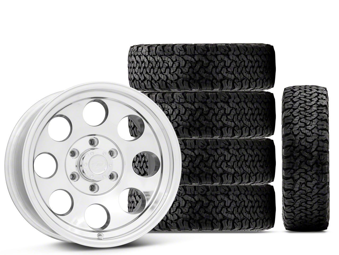 Mounted and Balanced Wheel and Tire Kit. This wheel and tire combo kit features (5) 17x9 Pro Comp Wheels 69 Series Polished 6-Lug Wheels and (5) BF Goodrich All-Terrain T/A KO 34" - 315/70R17 tires that have been put together into an easy to buy kit that arrives to your door already mounted and balanced ready to be installed on your vehicle.
