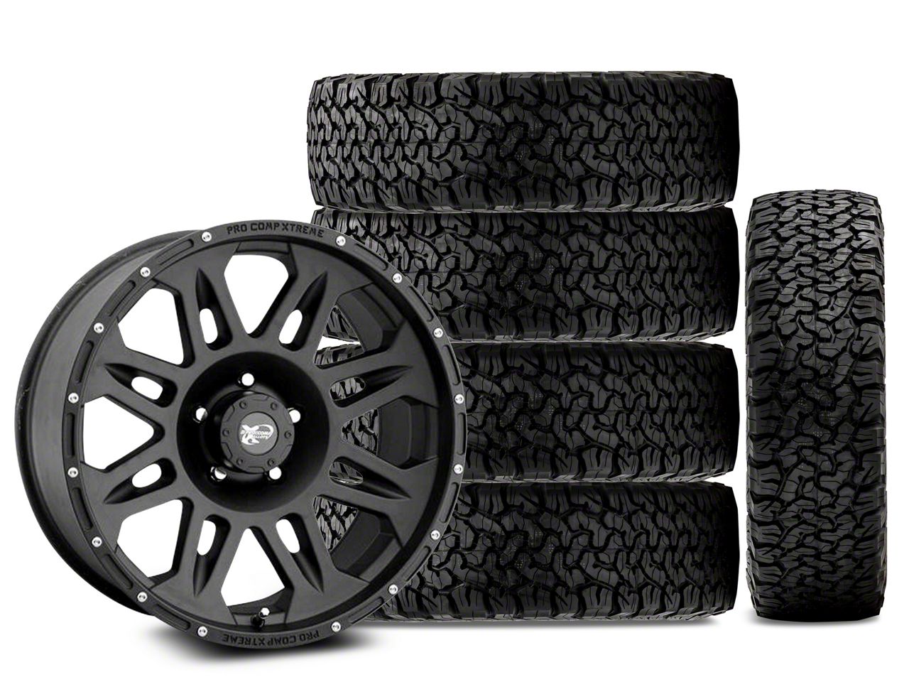 Mounted and Balanced Wheel and Tire Kit. This wheel and tire combo kit features (5) 17x9 Pro Comp Wheels 05 Series Torq Matte Black Wheels and (5) BF Goodrich All-Terrain T/A KO 285/70R17 tires that have been put together into an easy to buy kit that arrives to your door already mounted and balanced ready to be installed on your vehicle.