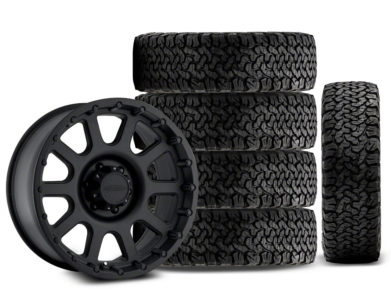 Mounted and Balanced Wheel and Tire Kit. This wheel and tire combo kit features (5) 17x9 Pro Comp Wheels 32 Series Bandido Flat Black Wheels and (5) BF Goodrich All-Terrain T/A KO 315/70R17 tires that have been put together into an easy to buy kit that arrives to your door already mounted and balanced ready to be installed on your vehicle.