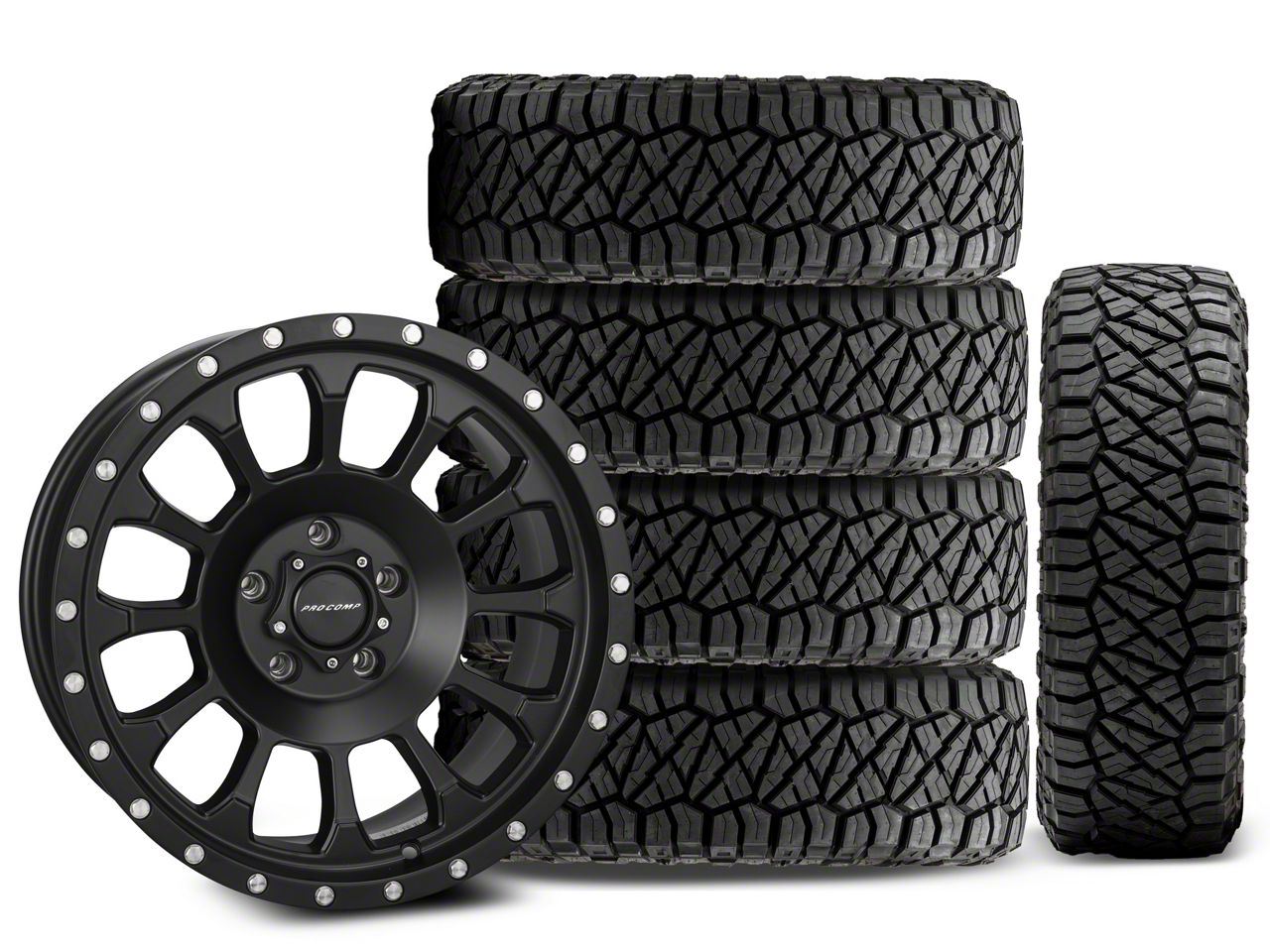 Mounted and Balanced Wheel and Tire Kit. This wheel and tire combo kit features (5) 18x9 Pro Comp Wheels Rockwell Satin Black Wheels and (5) NITTO All-Terrain Ridge Grappler A/T 35x12.50R18 tires that have been put together into an easy to buy kit that arrives to your door already mounted and balanced ready to be installed on your vehicle.