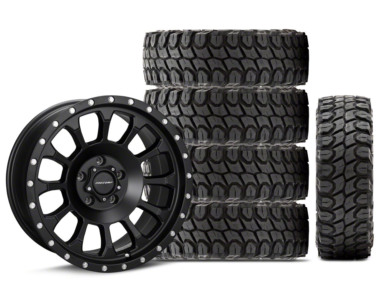 Mounted and Balanced Wheel and Tire Kit. This wheel and tire combo kit features (5) 18x9 Pro Comp Wheels Rockwell Satin Black Wheels and (5) Gladiator Mud-Terrain X-Comp M/T 35" - 35x12.50R18 tires that have been put together into an easy to buy kit that arrives to your door already mounted and balanced ready to be installed on your vehicle.