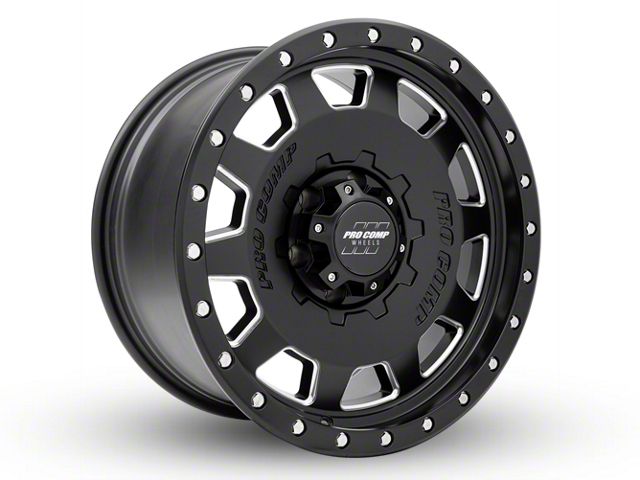 This 18x9 Pro Comp Wheels Hammer Satin Black Milled 6-Lug Wheel is completed in a high-quality satin black finish with steel milled accents that will be the envy of everyone. There's a durable clear coat that protects against driving hazards.