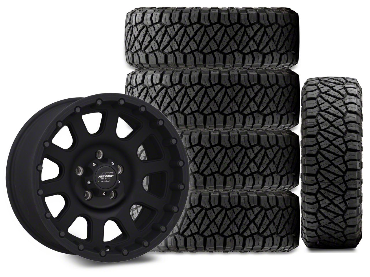 Mounted and Balanced Wheel and Tire Kit. This wheel and tire combo kit features (5) 17x9 Pro Comp 32 Series Bandido Flat Black Wheels and (5) NITTO Ridge Grappler All-Terrain 285/70R17 tires that have been put together into an easy to buy kit that arrives to your door already mounted and balanced ready to be installed on your vehicle.