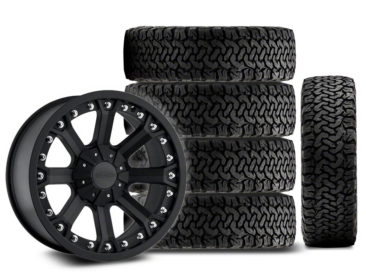 Mounted and Balanced Wheel and Tire Kit. This wheel and tire combo kit features (5) 17x9 Pro Comp 33 Series Grid Matte Black Wheels and (5) BF Goodrich All-Terrain T/A KO2 285/70R17 tires that have been put together into an easy to buy kit that arrives to your door already mounted and balanced ready to be installed on your vehicle.