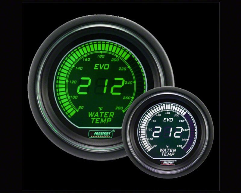 Evo Series. Add some stealthy style to the inside of your Pony with this Digital Evo Series Dual Color Water Temperature Gauge. Featuring a tinted lens with black bezel and black case, your gauge can be set to light up in one of two color options - green or white. Best of all, you have dimming capability so you can find the perfect setting for both day and night driving.