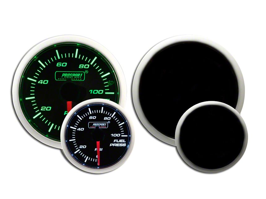 Stylish and Functional Fuel Pressure Gauge. The Prosport Electrical Dual Color Green and White Oil Pressure Gauge accurately measures fuel pressure between 0-100 PSI in your Wrangler TJ or JK. The analogue gauge provides greater accuracy over stock, so you can be sure that the level you see is what you get. The green and white lighting provide an exceptionally clear display to allow you to quickly check it while driving.