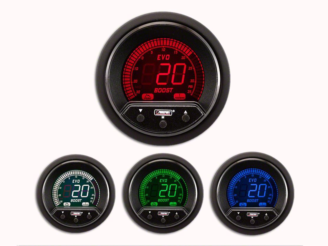 Customize Your Wranglers Display. The Prosport Premium Electrical Evo Boost Gauge displays the boost pressure of your Wrangler, as well as offering a programmable pressure level and warning alert. The clocks provide seven levels of dimming and four colors, offering a large scope for customizing your display. The gauge provides you with essential information for engine monitoring, allowing you to evaluate critical measurements in real time.