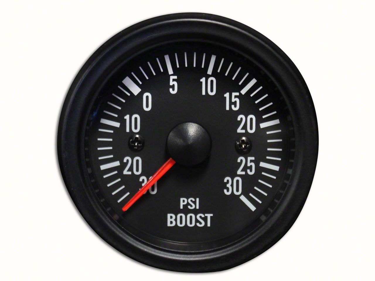 Simple Elegance. The Prosport White LED Boost Gauge provides a relatively stock addition to your dash. The gauge has a black housing, face, and bezel with a clear lens. Data is displayed from -30 to +30 PSI, and the vibrant red pointer scales the dial with precision.