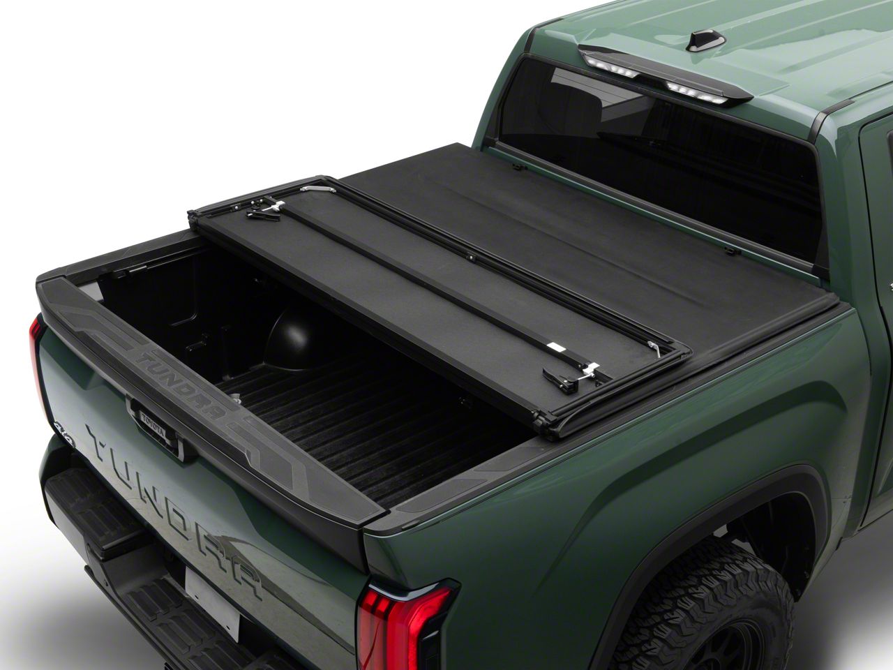 Protect Your Cargo in Style. Add a sleek, clean appearance to your 2022-2026 Toyota Tundra while discreetly hiding cargo and tools in the bed with a TruShield EZ Hard Tri-Fold Tonneau Bed Cover. This TruShield Bed Cover features a Tri-Fold design that can fold up to access your bed, or when hauling larger items. As an added bonus, you may even see up to a 10% increase in fuel mileage because of its aerodynamic design.