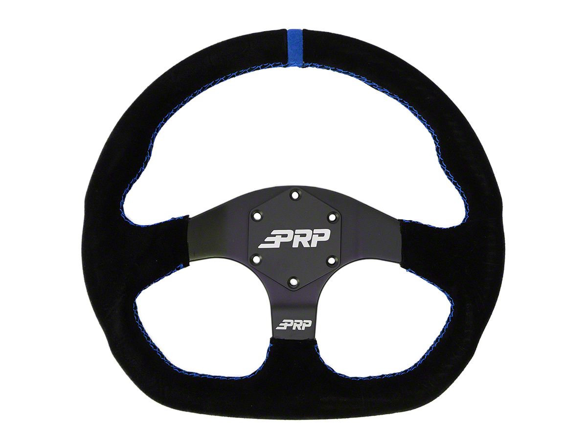 Precision Steering Feedback. This PRP Comp-R Suede Steering Wheel; Blue offers a 350-mm deep-dish design wrapped in high-grip suede, delivering crisp feedback and secure handhold during spirited driving or off-road maneuvers. The 12-o-clock yellow centermark aids in rapid wheel orientation.